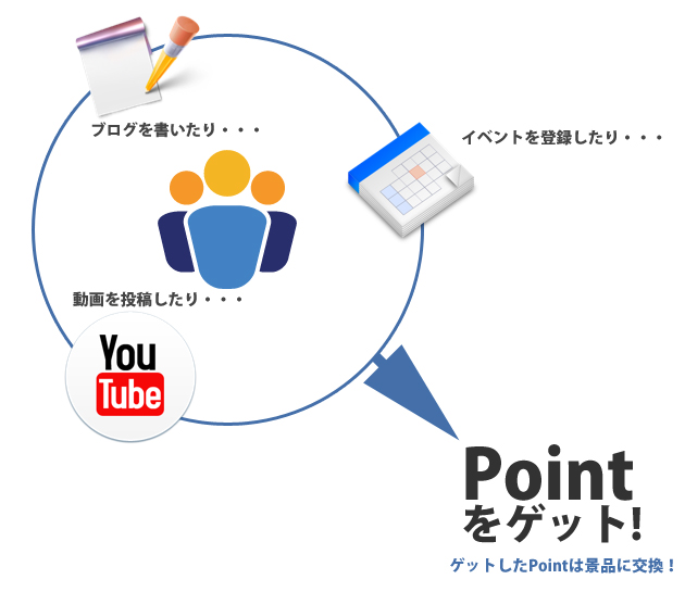 ユーザーはブログを書いたり、YouTube動画を投稿したり、フォトを投稿する事でポイントを獲得する事が出来ます。獲得したポイントは運営者ユーザーによって設定される景品と交換する事が可能です。景品は運営者が自由に登録・編集が出来る仕組みになっています。